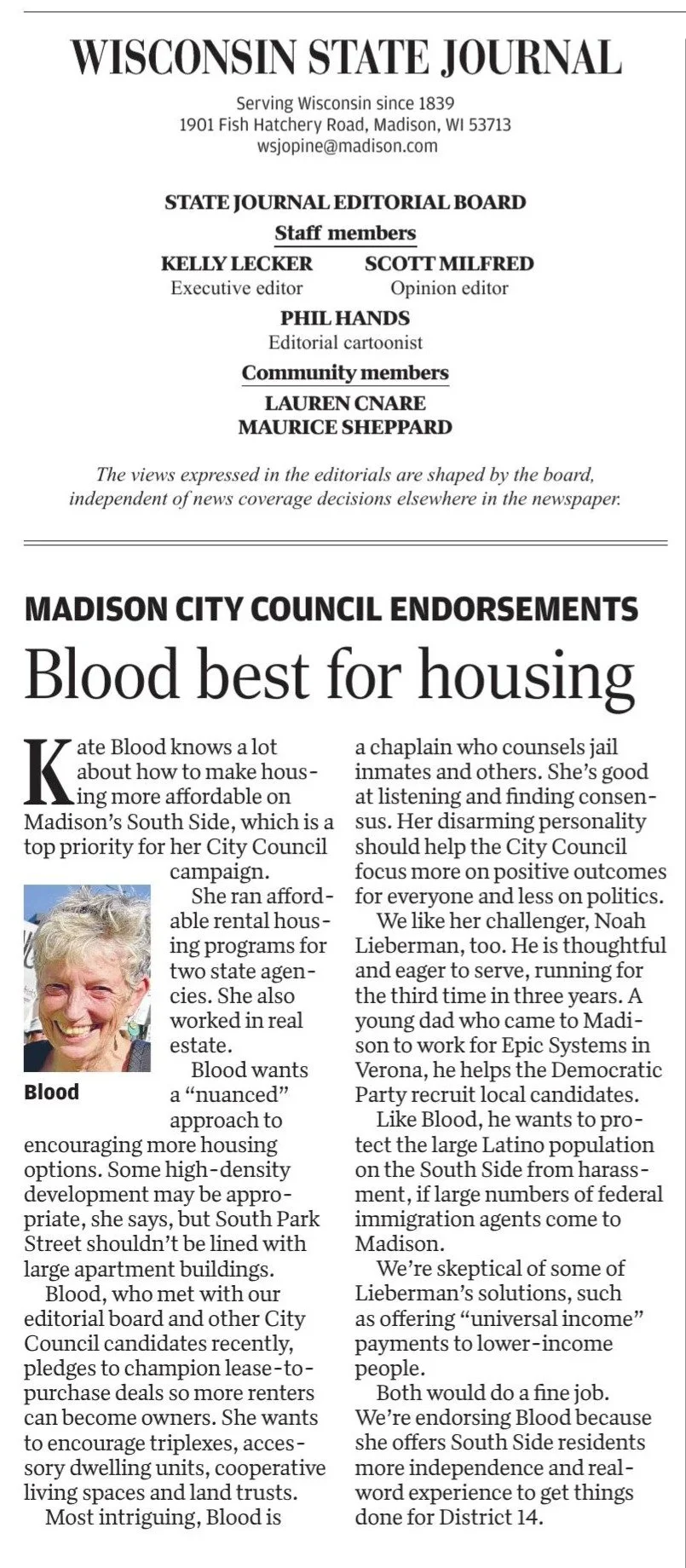 — Sarah Lawton, District 14 Resident“Kate Blood knows a lot about how to make housing more affordable on Madison’s South Side . . . her disarming personality should help the City Council focus more on positive outcomes for everyone and less on politics. We’re endorsing Blood because she offers South Side residents more independence and real-world experience to get things done for District 14. ”